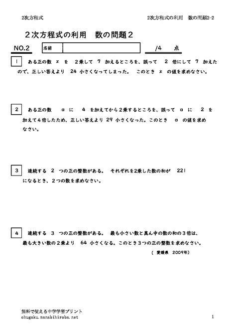 2次方程式の文章題1ー数の問題 無料で使える中学学習プリント
